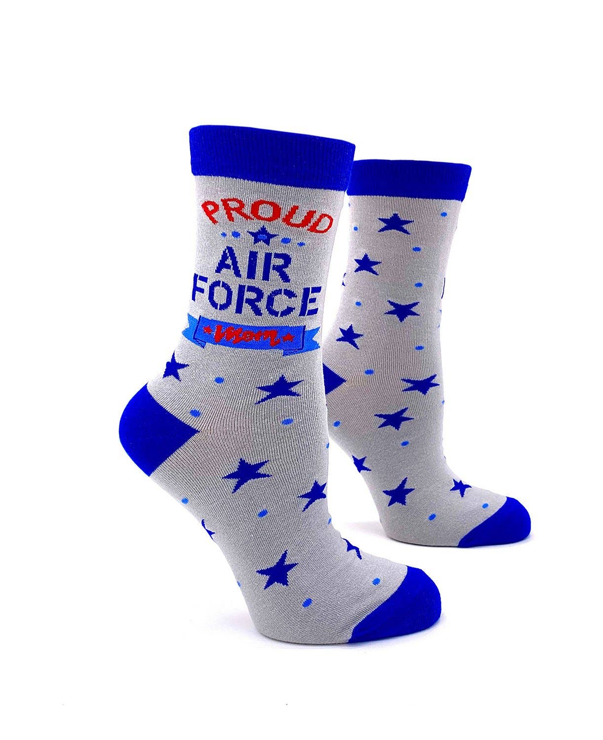 Proud Air Force Mom Women's Crew Socks Stylish and comfortable! Fits ladies' shoe size 5 to 10. 80% Cotton, 15% Nylon, 5% Spandex. Easy Care - Machine Wash.