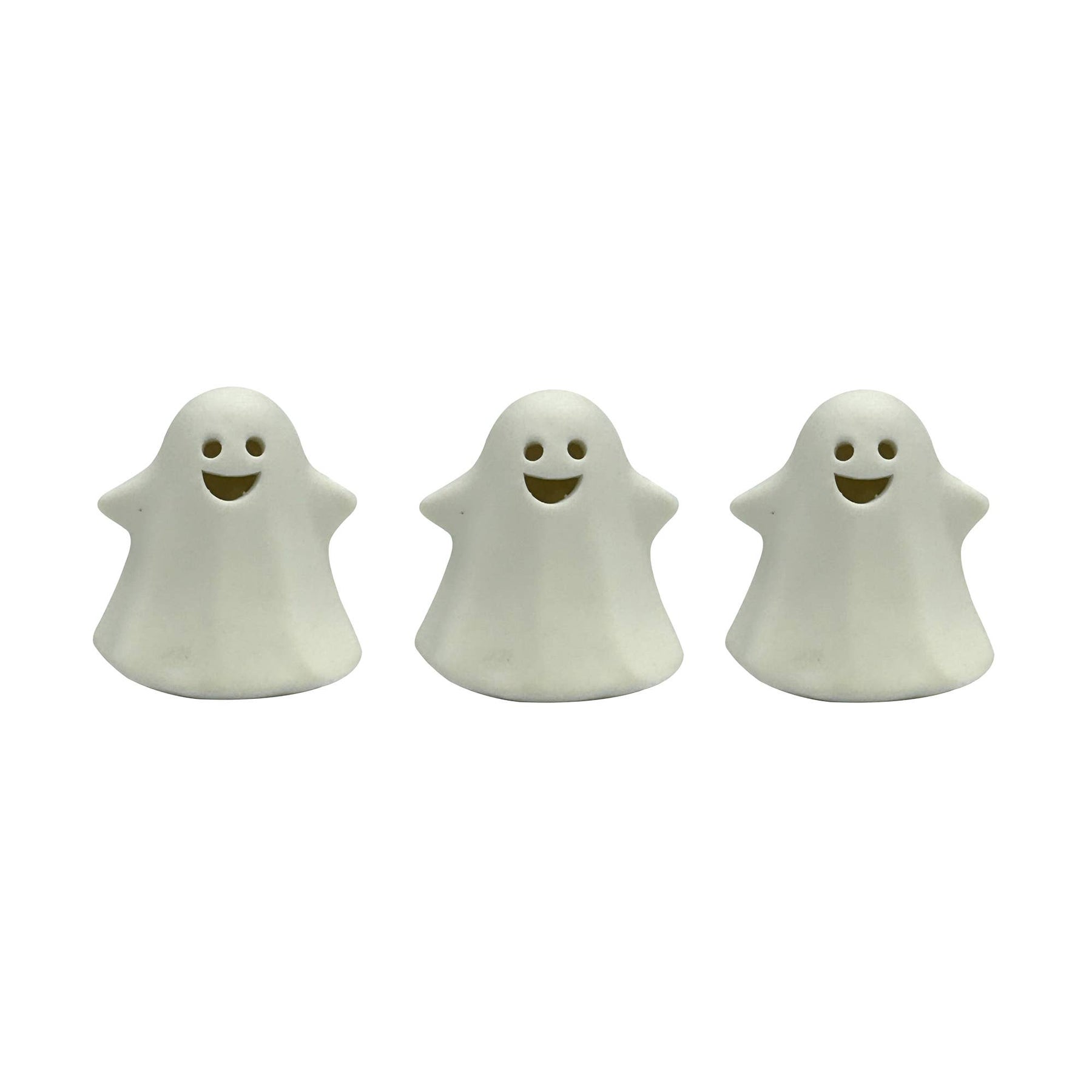 Brighten up your indoor Halloween décor with these battery-operated ceramic ghosts. These cute, off-white ghosts feature a warm white LED light to give their smiling faces a magical glow. These adorable little ghosts will add ambient illumination to a mantel, table setting, or centerpiece. This set of three lighted ghosts will be sure to delight your guests at a Halloween party or celebration. Each ceramic ghost requires 3 LR44 batteries (included). - Ceramic Construction - Steady Warm White LED Light - Dimensions: 2.7" x 2.4" x 3" - On/Off Switch - Indoor Use Only