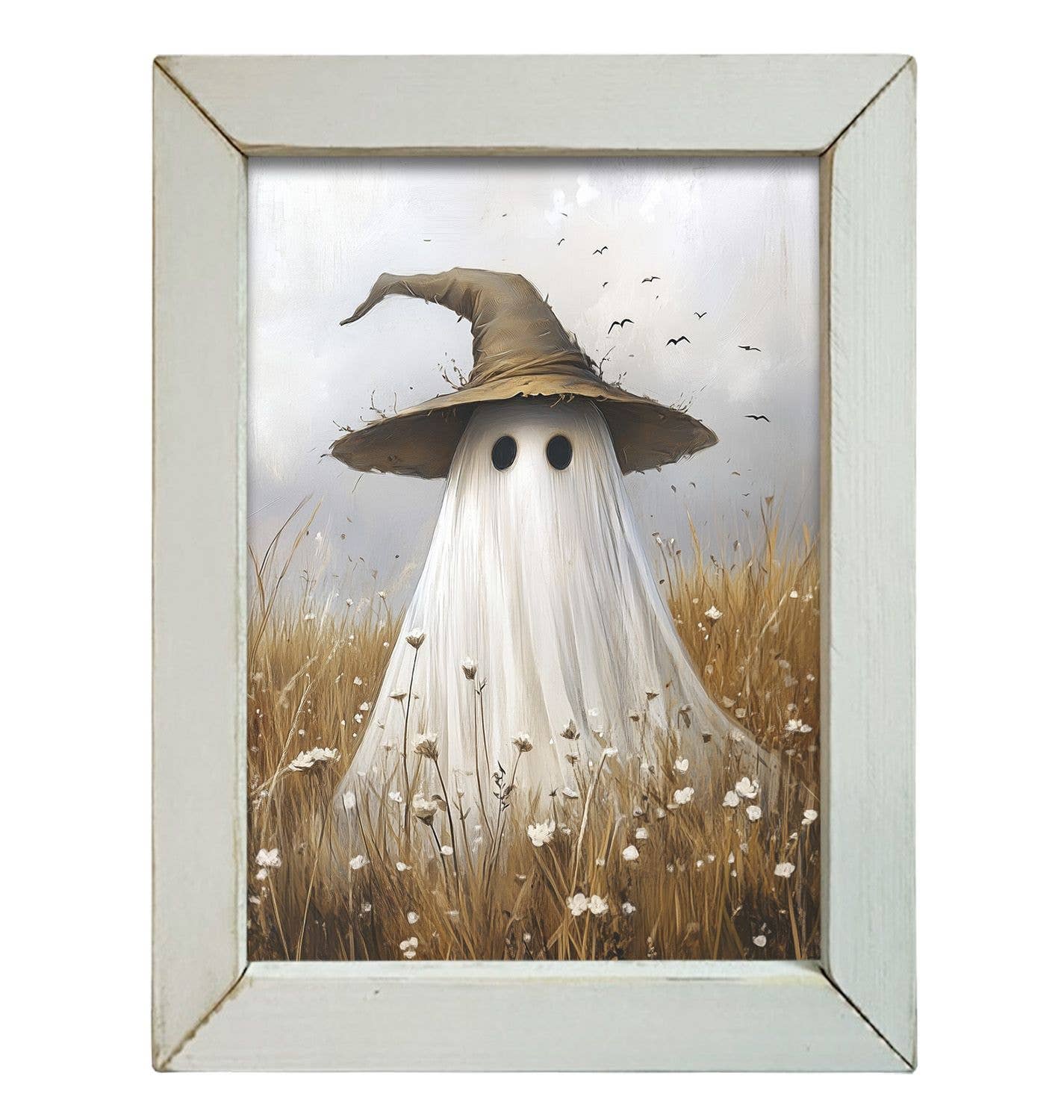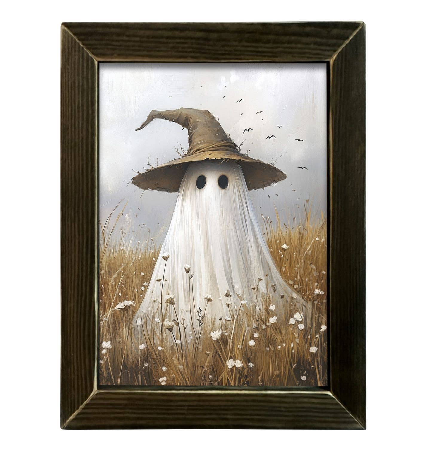 This picture is called "Fall Ghost with Hat". The print unframed measures 12x16 inches. The frame will add about one more inch per side. In this autumnal scene, a gentle ghost stands through a dry, golden field, the faded hues of fall surrounding it. On its head sits a weathered witch’s hat, slightly tattered and worn, adding a touch of whimsical charm. The scene feels quiet and peaceful, with an air of nostalgia and the magic of the fall season lingering in the cool breeze. Choose your lath frame color to customize your product. All frames have a vintage wire along the top of the frame for quick and easy wall hanging.