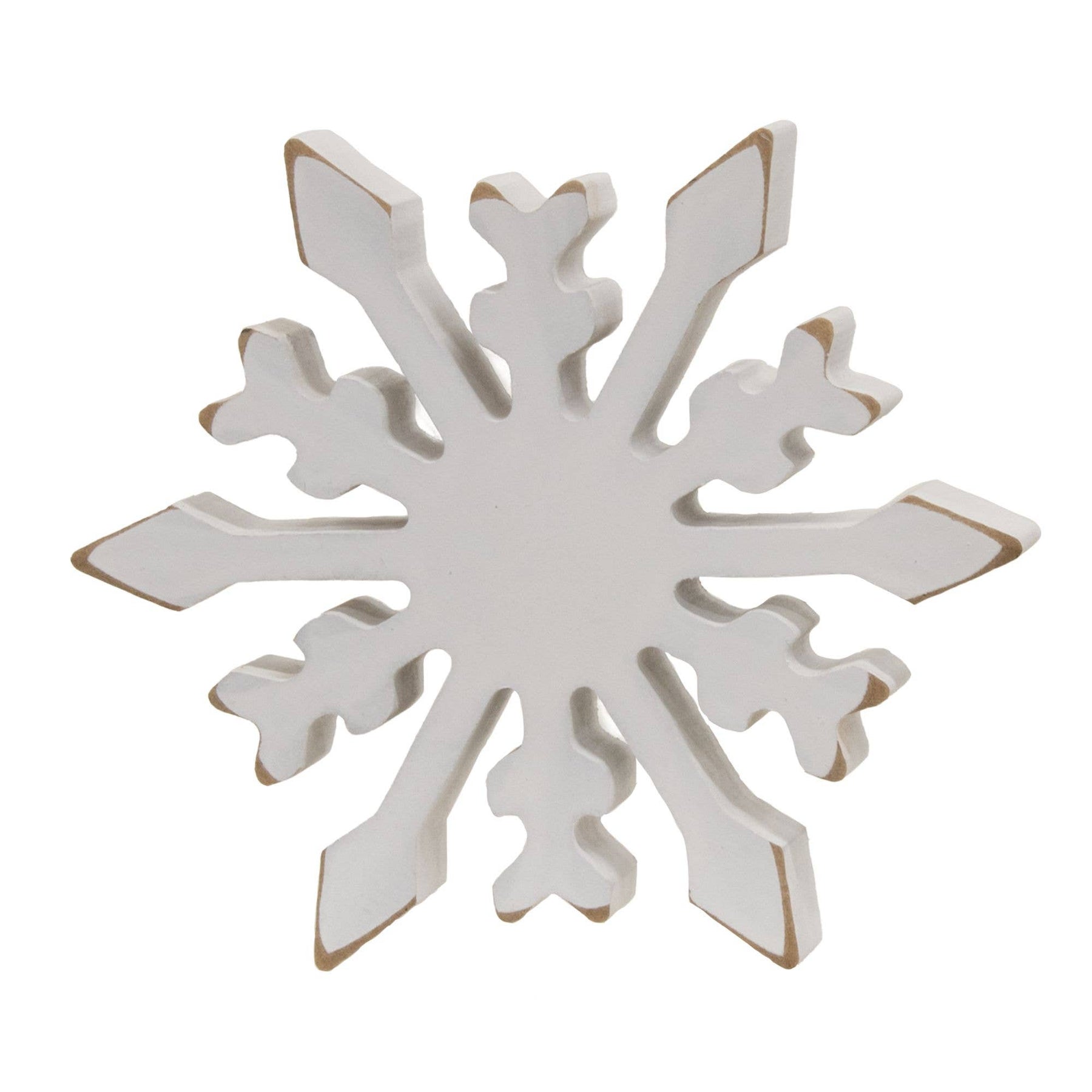 Let beauty and delight fall into the farmhouse this Winter with the Distressed Chunky Wooden Snowflake Sitters set. These lovely wooden sitters come in three styles with a white finish and distressed edges. All have a .75" depth for easy freestanding display. The small is 4" in diameter, the medium 5" in diameter, and the large 5.75" in diameter. These snowflakes add beauty and interest to signs, candles, and other Winter and holiday staples. They look great with a wide variety of styles and Winter florals.
