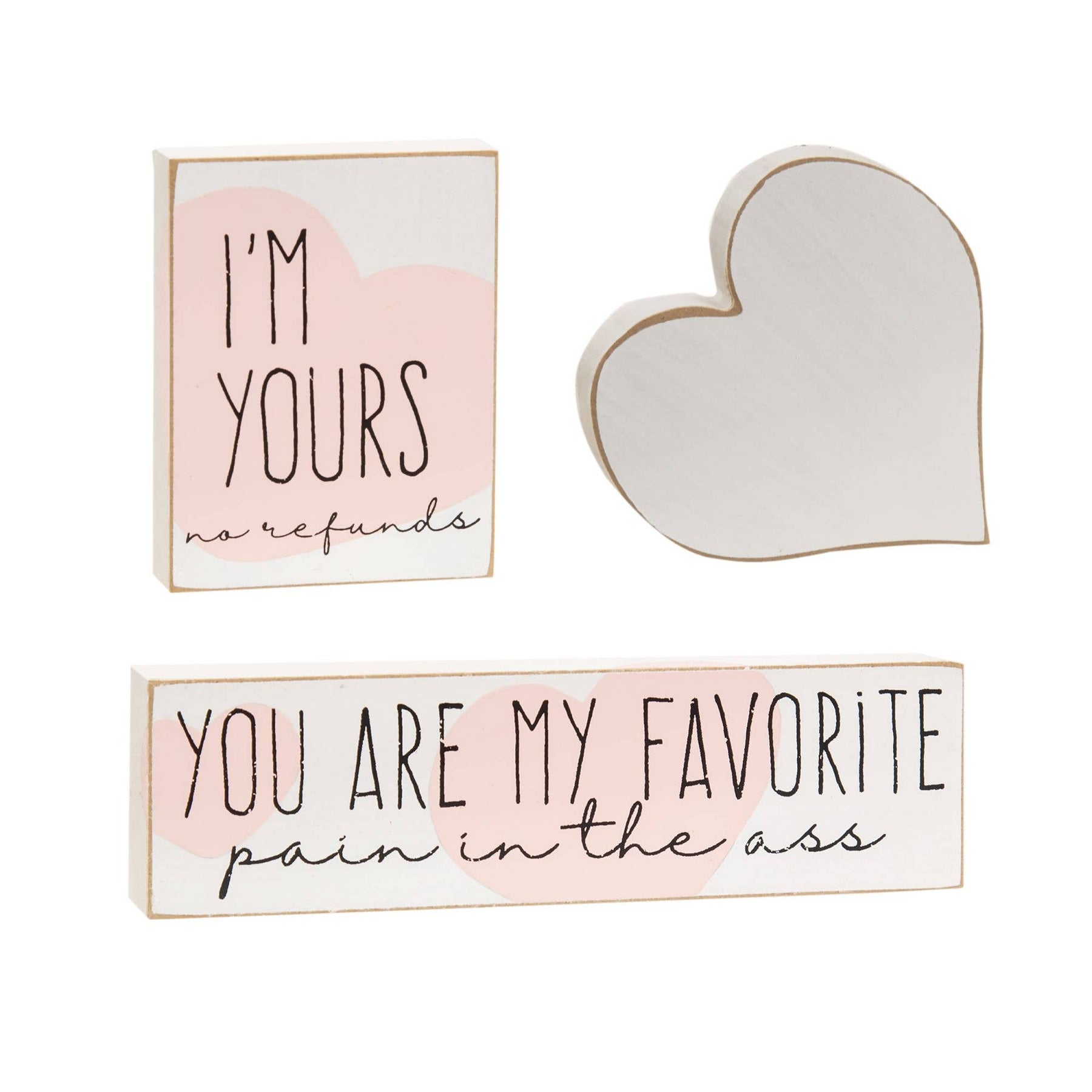 The I'm Yours Blocks set is a lovely set of sitting blocks that pokes fun at love in a sweet way. These wooden sitters have a white finish with distressed edges and are .75" deep for sturdiness. One block measures 4" high by 3" wide and reads, "I'm yours – no refunds" in black script and text over a subtle pink heart. The second block measures 2" high by 7" wide and reads ,"You are my favorite - pain in the ass" in black script and text with two subtle pink hearts. The pink hearts on both signs wrap around the edges of the blocks. The last block is a heart-shaped cutout in white to contrast the pink hearts on white backgrounds of the other signs. This funny set of loving blocks is perfect displayed together or can be separated to spread the love around.