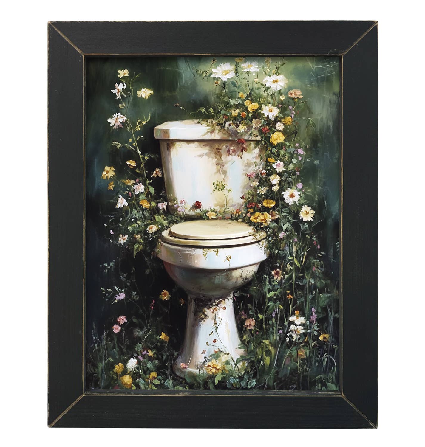 Unexpectedly elegant and delightfully whimsical, this 12x16 inch Vintage Green Potty print brings a playful twist to classic floral art. A vintage toilet, weathered with charm, is overtaken by a lush cascade of wildflowers and greenery—set against a rich green background that adds depth and drama. It's a bold, humorous, and surprisingly beautiful conversation piece perfect for those who appreciate quirky decor with artistic flair.